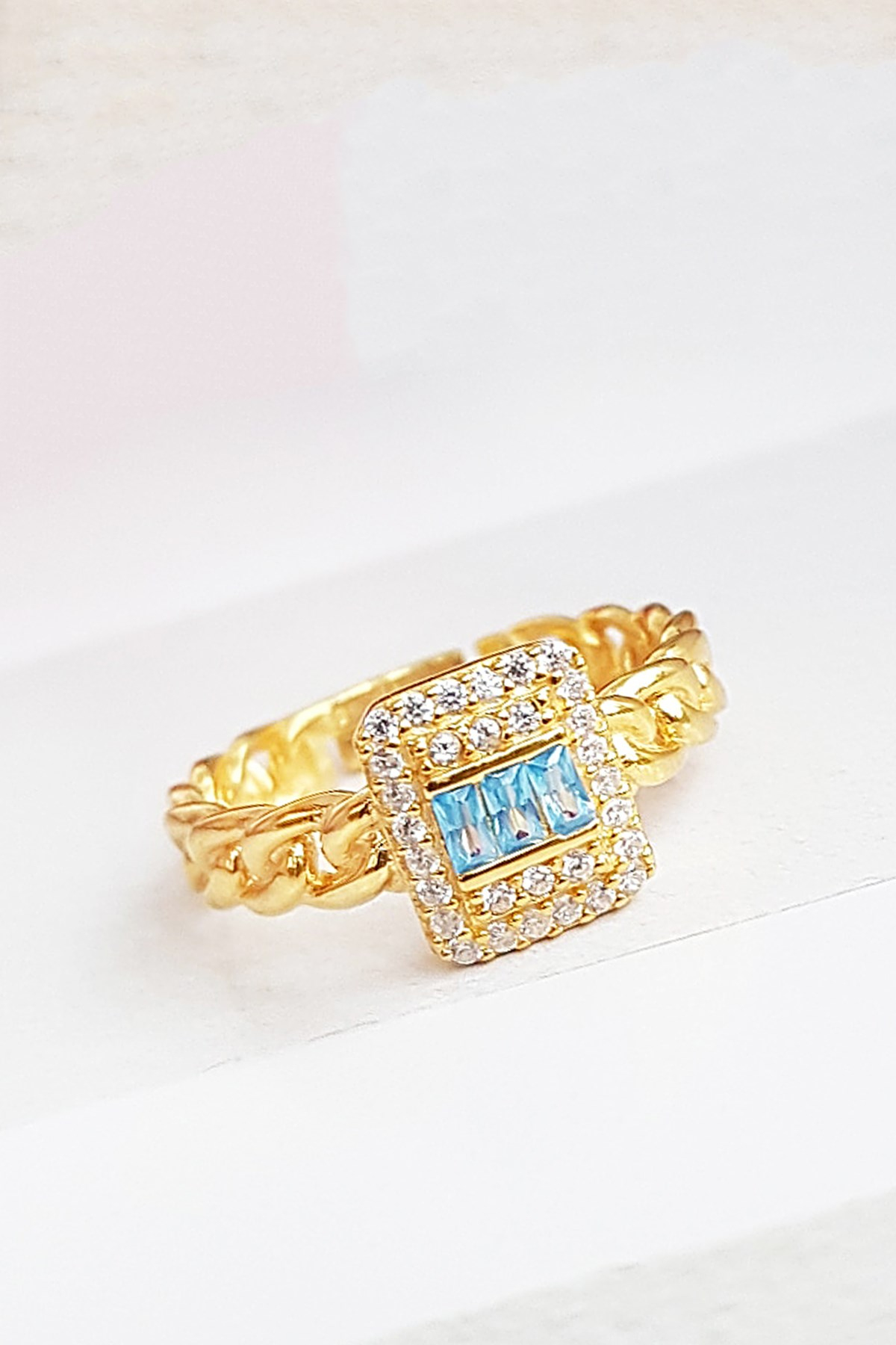 AQUA TAŞLI BAGET ZİNCİR GÜMÜŞ YÜZÜK