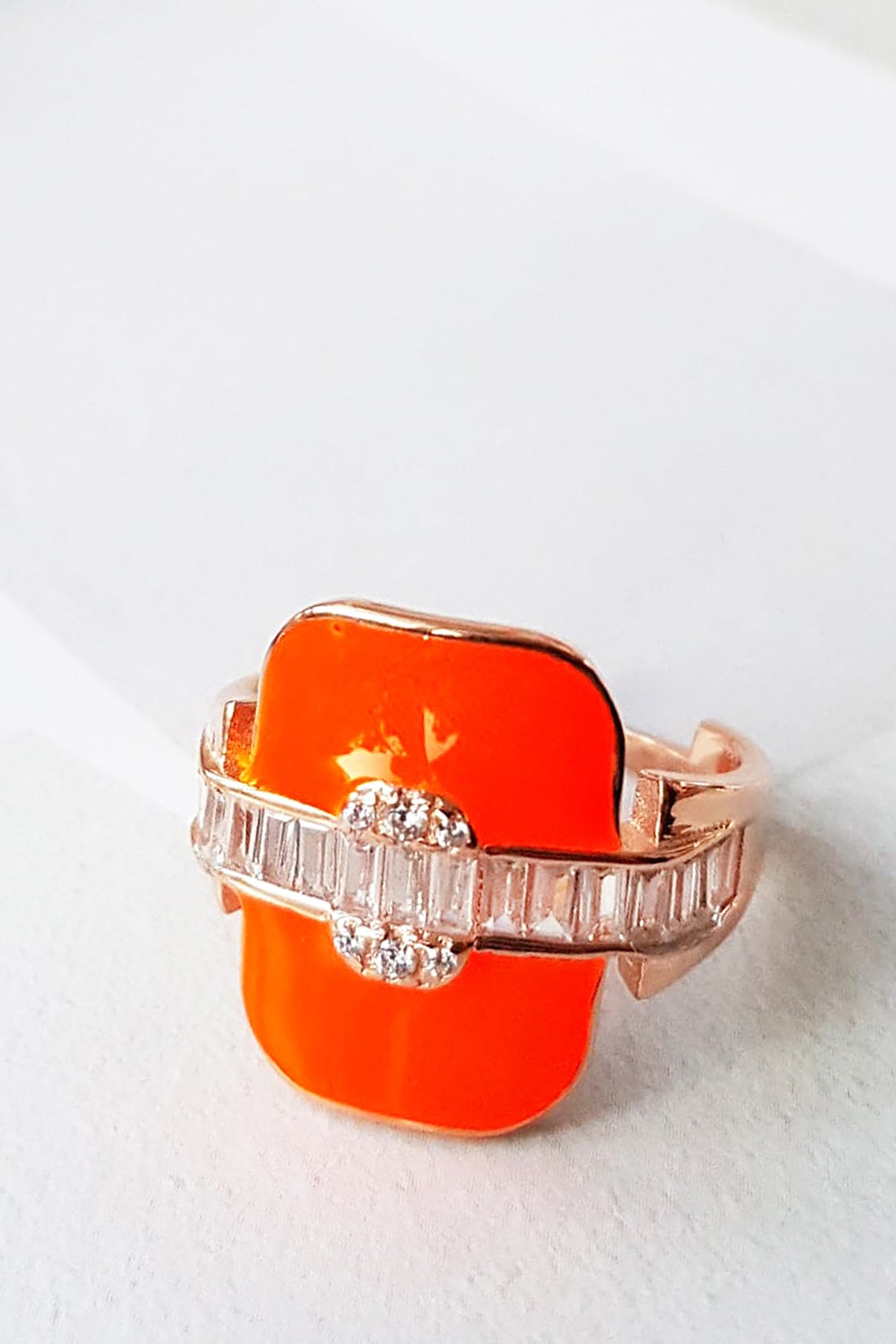 TURUNCU NEON BAGETLİ MİNELİ GÜMÜŞ YÜZÜK